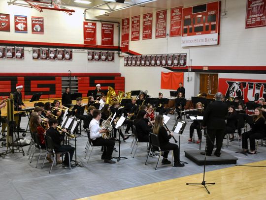 ON THIS Day Earth Shall Ring, Hope and Celtic Carol were played by the Auburn High School Symphonic Band to conclude the evening. Band members are: Marc Bohling, Nani Boyd, Emma Falk, Emma Feilen, Gillian Hanna, Alexa Janssen and Anna Schlange on flute; Emma Dunekacke, Addison Fankhauser, Laurynn Fankhauser and Twila Haynes on flute; Jack Hayes on bass clarinet; Rilee Dotson, Max Johnson, Jonah Schlange and Colt Zentner on alto saxophone; Kale Davidson and Abby Donner on baritone saxophone; Ella Ackley, Landry Allen, Nash Crotty, Sophie Falk, Lily Harrah, Karlito Holthus, Eli Mueller, Hunter Stevenson and Cale Zentner on trumpet; Kyle Jones on french horn; Riley Dickerson and Caleb Cover on trombone; Wyatt Beard, Jacob Crotty and Solomon Jacobitz on baritone; Zack Haynes, Tyler Koeneke and Ethan Pemberton on tuba; and Charlotte Dickerson, Ian Mather, Gretchen Paschal, Charlize Phillips, Elijah Powell and Grace Zhang.